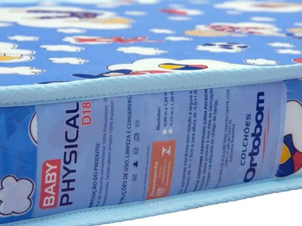 O Colchão Baby Physical é altamente resistente e confortável, ideal para berço americano. Composto por placa de espuma convencional 100% poliuretano D18, revestimento tecido plano simples poliéster de alta performance, proporciona melhor sustentação e durabilidade ao produto.