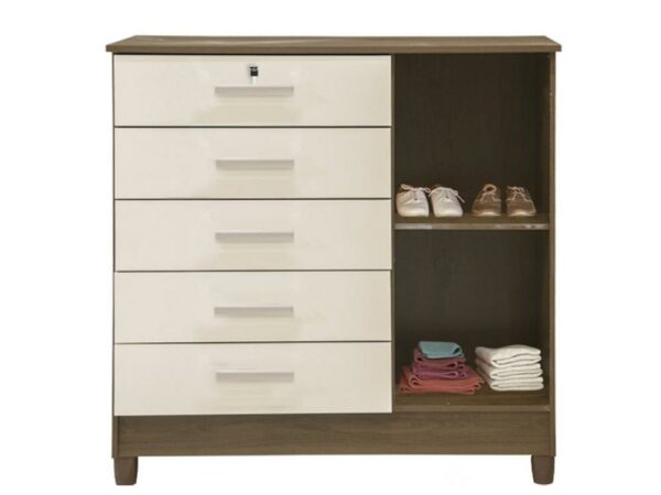Cômoda Vitória 5 gavetas 1 porta – Mel/Off white