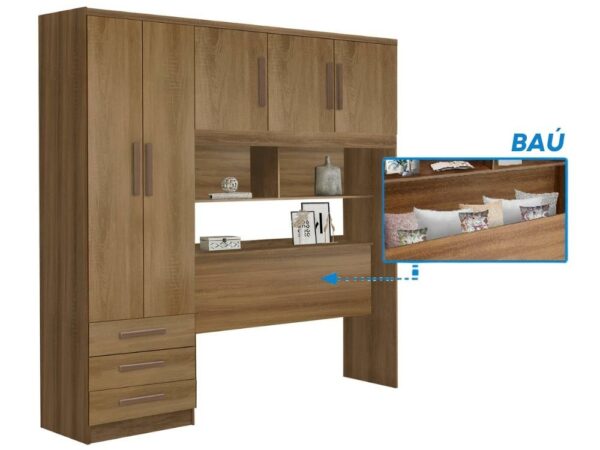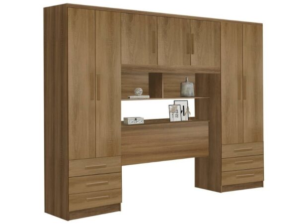 O Guarda Roupa Acoplado México + Floripa de Casal 7 Portas é ideal para otimizar o espaço do ambiente e deixar tudo organizado. Possui 3 nichos internos, 2 nichos externos, 1 baú na cabeceira, 7 portas articuladas, 5 gavetas externas com corrediças metálicas. Possui pintura UV com acabamento texturizado amadeirado, que oferece ao produto resistência e durabilidade.