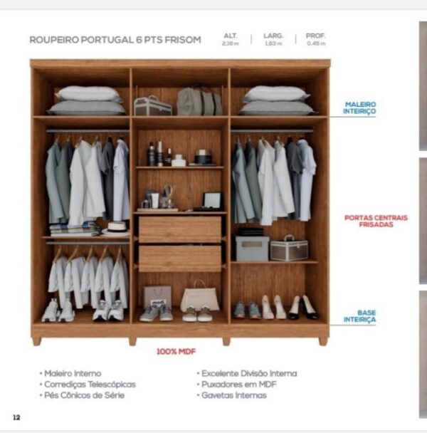 Estrutura 100% MDP Chapa de 15mm, 6 Portas de Bater com Dobradiças Metálicas, sendo as 1 Centrais com Detalhes Frisados, 2 Gavetas Internas com Corrediças Telescópicas, 2 Cabideiros 1 Calceiro, 7 Nichos Internos para Objetos Pessais, Roupas e Sapatos, Puxadores de MDF e Pés Plásticos de PVC,