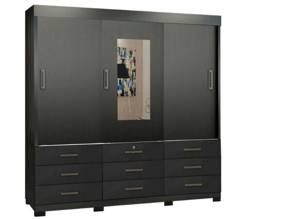 O Guarda Roupa Casal Itapema 3 Portas de Correr e 9 Gavetas com Espelho tem a característica principal de uso que dispõe de 9 gavetas grandes sendo uma com chave para maior privacidade, tendo acabamento a pintura texturizada dando a sensação real de madeira, o produto por ser porta de correr, tem o maior aproveitamento de espaço.